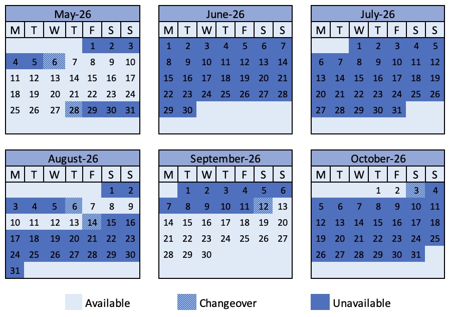 - We accept any day of the week for arrivals and departures.
